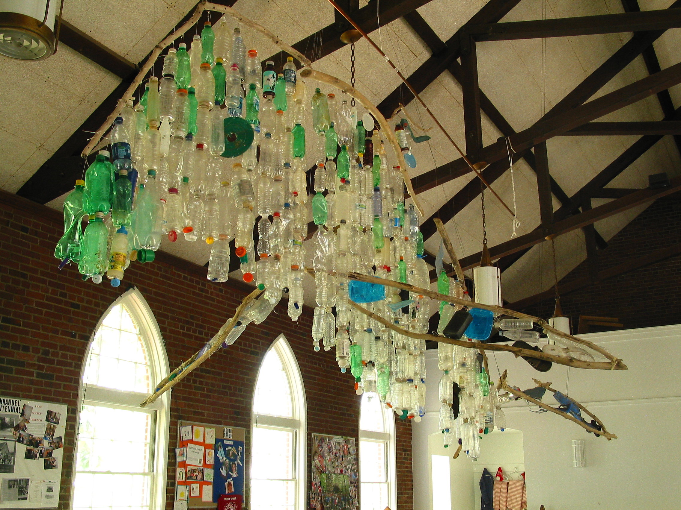 The Whale (2011) was made entirely from driftwood, bottles, and other plastic pulled from the Potomac River by my family as part of their own personal river cleanup and constructed with the help of many family, students, and friends. Since a big part of me is still that young girl growing up at the beach in Florida, this twenty-five foot long mobile raises for me important questions about the state of our rivers and oceans and what we want to inhabit them: the real creatures of the sea or plastic facsimiles. The Whale initially was a temporary installation hung at Emmanuel Episcopal Church in Alexandria, Virginia, as part of a fundraiser for Matthew Maury Elementary School, and after the event the church welcomed it for an extended showing that was very much appreciated!