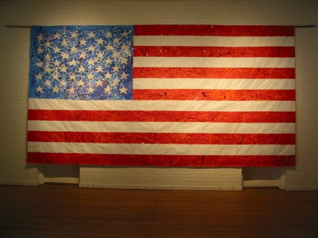 A star-splattered banner (2010) serving as an homage pulling together the work of two great American artists who were trying to pull art in two different directions: Jackson Pollock and his abstract expressionist action paintings (always a kid favorite!) and Jasper Johns and his concrete images of American flags. This piece was displayed in a couple of locations including a First Thursday event in my neighborhood of Del Ray.