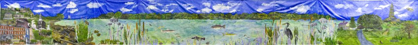 This thirty-six-foot panoramic collage co-created with my long-time teaching and art collaborator Peggy Ashbrook explores the ecology and evolution of Alexandria’s waterfront communities and the relationship between Alexandria’s natural and built environments, a part of our experience that often is lost for us as we become increasingly urbanized. In taking the viewpoint of the Potomac River and therefore not distinguishing between the importance of historic community institutions built and shaped by Alexandria’s African American and white communities in the neighborhoods along the Potomac’s banks, the collage also tries to prompt us to consider some important social truths about the history and legacies of our Alexandria’s experience as the northernmost outpost of Jim Crow segregation. That it hangs prominently in a public space for children, Alexandria City’s Soft Play Room at the Chinquapin Recreation Center, is therefore as an important marker for the continuing evolution of the City of Alexandria itself. Children can see aspects of the art of Romare Bearden in the collaging technique and of the great Mexican muralists like Diego Rivera in the scope and positioning of the work’s different elements.